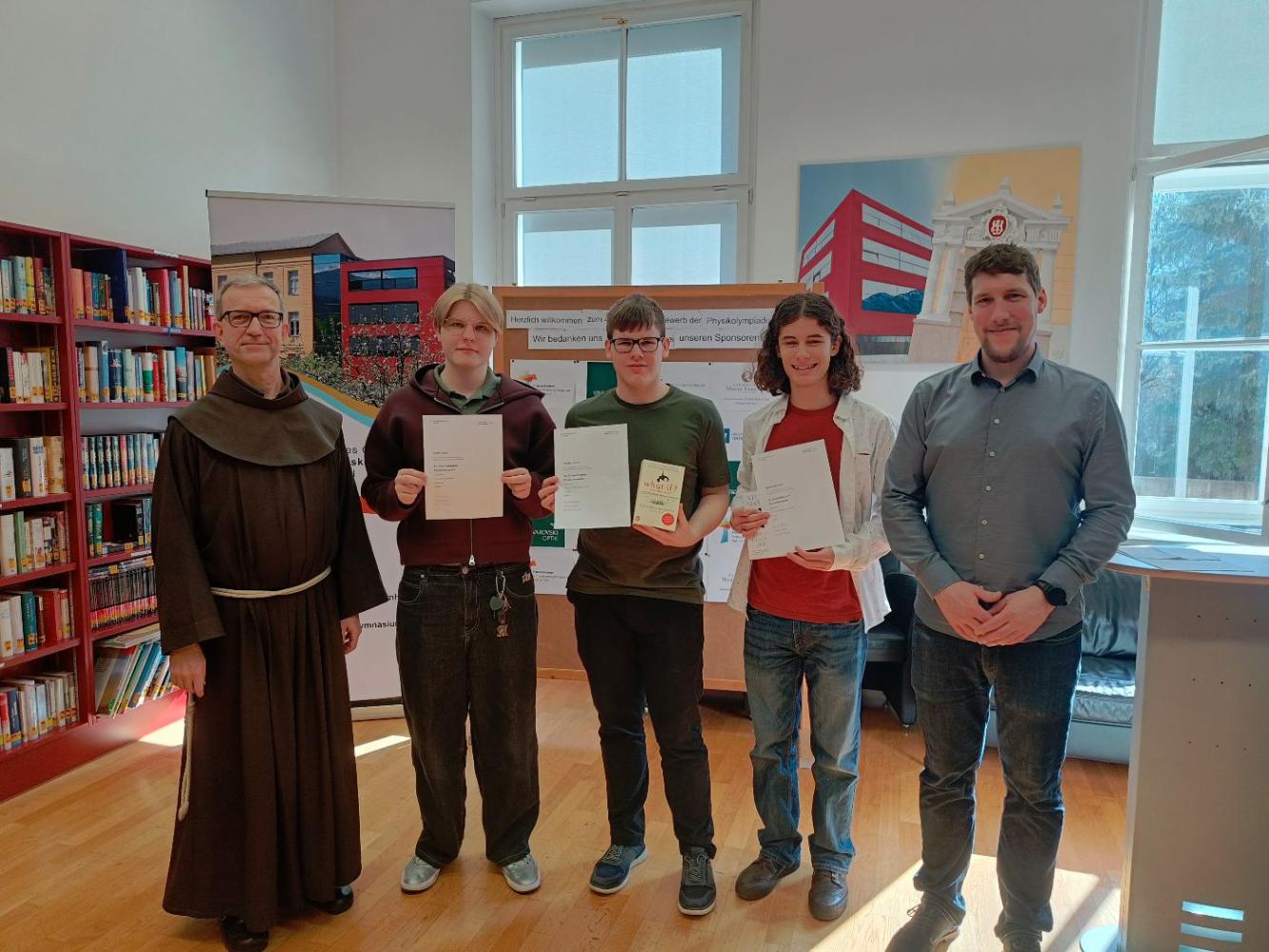 Am Abend kam das Soziale natürlich nicht zu kurz und so war die Zeit bis zur Siegerehrung am Mittwoch, welche bei uns in der Bibliothek der Schule stattfand, schnell vorbei. Die Klasse 1d unter der Leitung von Fr. Prof Oberthanner sorgte mit ihren Liedern für einen feierlichen Rahmen. Zwei unserer Schüler - Adrian Hermann (8b) und Philipp Larcher (7b) - schafften dabei eine sensationelle Platzierung in den Medaillenrängen! Rafael Spika (6b) erreichte eine Anerkennung. Herzliche Gratulation im Namen der ganzen Schule! Lust auf Physik und Experimente? Komm auch du vorbei in der Physikolympiade!